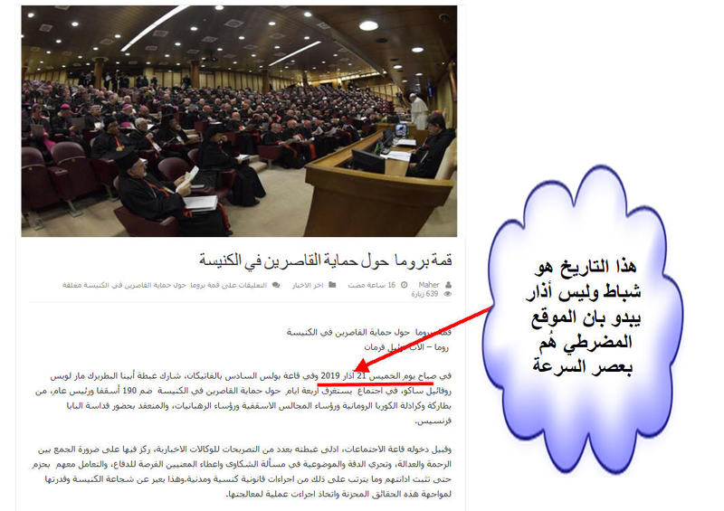 في صباح يوم الخميس 21 آذار 2019 وفي قاعة بولس السادس بالفاتيكان، شارك غبطة أبينا البطريرك مار لويس روفائيل ساكو، في سينودس – مجمع ضم 190 أسقف ورئيس عام، من رؤساء المجالس الاسقفية ورؤساء الرهبانيات، والمنعقد بحضور قداسة البابا فرنسيس بخصوص حماية القاصرين في الكنيسة.