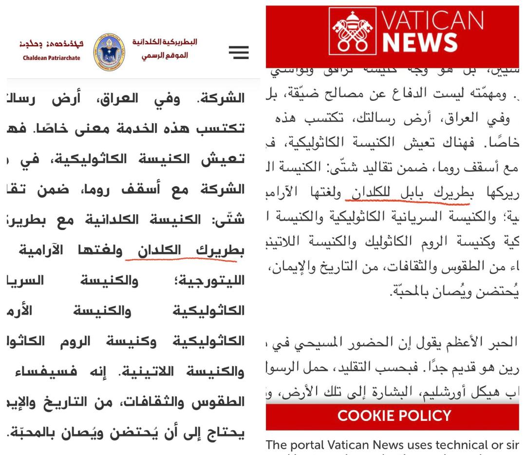 حيّ الله البابا لاون، باينته جايب الخير للكنيسة الكلدانية المضطهدة من قبل ساسوكي ومطارنة السينودس ومبروك لبطريركية بابل الكلدانية ولغتها الآرامية وليخسأ الخاسؤون.