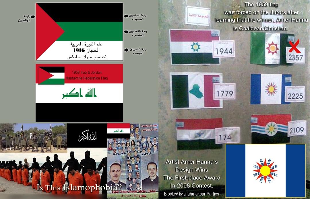 في عام 2008م أجريت مسابقة دولية لتصميم (علم العراق الوطني)، أنتهت بفوز تصميم متميز لفنان دولي معروف (كاتب المقال)، يعبر التصميم بأسلوب راقٍ ومتمكن عن العراق تاريخاً وحضارة (الرافدين والشمس العراقية)، مثلما يحترم جميع مكونات العراق على تنوعها، ولهذا قامت لجان التحكيم المتخصصة بتزكيته. لكن الأحزاب الإسلامية الموالية لدولة (ولاية الفقيه) والعناصر البعثوية العروبية المُخربة، تحالفت معاً برغم صراعها اليومي على السلطة، وذلك من أجل حظر إستخدام علم العراق الوطني الجديد رغم فوزه بالمسابقة، لا لسبب، إلا لأن مصمم العلم (كلداني مسيحي).
