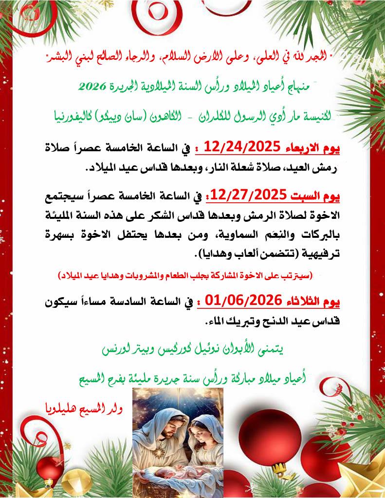 News Arabic منهاج أعياد الميلاد ورأس السنة الميلادية الجديدة لكنيسة مار أدي الرسول للكلدان في الكهون- كاليفورنيا 4 months ago1 Min Read Kaldaya Me Share This! FacebookLinkedInPinterestX You may also like الى غبطة البطريرك الجديد بعد ان اتخذت بعض القرارات قبل (تنصبيك) لرسامتك البطريركية، هل وقفت انتخاب اسقف لابرشية مسقط راسك الذي ترك الرهبنة الكلدانية الهرمزدية بالمساومات مع سلفك – ومغامراته بين يديك – ارشيف؟ اذا تم قبوله؟ !!!! 1 day ago Traditional Chaldean Morning Prayer after Easterصلاة الصباح الكلدانية التقليدية بعد عيد الفصح 4 days ago تهنئة كنيسة مار أدي الكلدانية الرسولية لپطريرك بابل على الكلدان الجديد 6 days ago About the authorView All Posts Kaldaya Me عيدانية السوداني نعال على فم ساكو من منبر كنيسته عن التطبيع مع اسرائيل هل من الممكن السكوت عن هكذا إهانات التي تعرضت عليها مقبرة شقلاوة؟؟؟؟ Share This! FacebookLinkedInPinterestX Follow Us facebook youtube Literature Traditional Chaldean Morning Prayer after Easterصلاة الصباح الكلدانية التقليدية بعد عيد الفصح ܪܡܫܐ ܕܚܕܒܫܒܐ ܘ ܕܨܘܡܐ صلاة الرمش لاحد السادس من الصوم بمناسبةعيد الميلاد الـ 85لمثلث الرحمات مار سرهد نهدي محاضرته القيمةعن القداس الكلداني الاصيل والقداس “التأوين” والتلوين The conversation (in Chaldean) that took place between His Beatitude Patriarch Cardinal Louis Sako and the young man Fr.Mina George in Rome on October 26, 2018 اسم الكلدان حقيقة لا مفر منه منقور على ختم خلفاء البطريرك مار شمعون الثامن يوحنا سولاقا تحت لقب محيلا شمعون بطريركا دكلدايي Documents الكلدان منذ بدء الزمان Assyrian Bishop Mar Awa Royel Replies to the Unity offer by Chaldean Catholic Patriarch Amer H. Fatuhi Chaldean Historian and Artist ܐܵܢܵܐ ܟܲܠܕܵܝܵܐ ܛܟܼܣܐ ܕܐ̄ܪ̈ܙܐ ܐܠܗܝ̈ܐ ܡܢ ܐܨܚܬܐ ܡܫܪܪܬܐ ܕܚܘܕܬܐ ܛܟܼܣܝܐ 2006 Search Archives April 2026 March 2026 February 2026 January 2026 December 2025 November 2025 October 2025 September 2025 August 2025 July 2025 June 2025 May 2025 April 2025 March 2025 February 2025 January 2025 December 2024 November 2024 October 2024 September 2024 August 2024 July 2024 June 2024 May 2024 April 2024 March 2024 February 2024 January 2024 December 2023 November 2023 October 2023 September 2023 August 2023 July 2023 June 2023 May 2023 April 2023 March 2023 February 2023 January 2023 December 2022 November 2022 October 2022 September 2022 August 2022 July 2022 June 2022 May 2022 April 2022 March 2022 February 2022 January 2022 December 2021 November 2021 October 2021 September 2021 August 2021 July 2021 June 2021 May 2021 April 2021 March 2021 February 2021 January 2021 December 2020 November 2020 October 2020 September 2020 August 2020 July 2020 June 2020 May 2020 April 2020 March 2020 February 2020 January 2020 December 2019 November 2019 October 2019 September 2019 August 2019 July 2019 June 2019 May 2019 April 2019 March 2019 February 2019 January 2019 December 2018 November 2018 October 2018 September 2018 August 2018 July 2018 June 2018 May 2018 April 2018 March 2018 February 2018 January 2018 December 2017 November 2017 October 2017 September 2017 August 2017 July 2017 June 2017 May 2017 April 2017 March 2017 February 2017 January 2017 December 2016 November 2016 October 2016 September 2016 August 2016 July 2016 June 2016 Calendar December 2025 S M T W T F S 123456 78910111213 14151617181920 21222324252627 28293031 « Nov Jan »