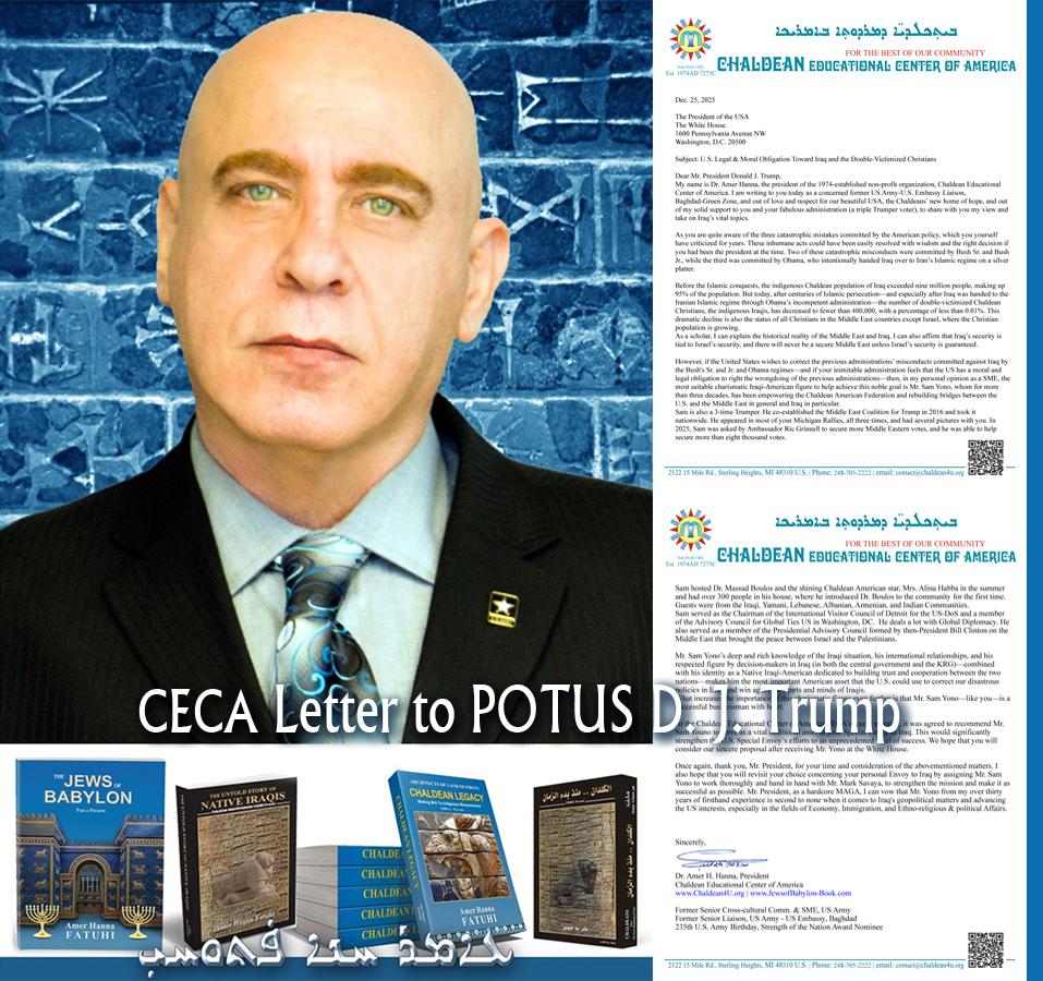 My name is Dr. Amer Hanna, the president of the 1974-established non-profit organization, Chaldean Educational Center of America. I am writing to you today as a concerned former US Army-U.S. Embassy Liaison, Baghdad-Green Zone, and out of love and respect for our beautiful USA, the Chaldeans’ new home of hope, and out of my solid support to you and your fabulous administration (a triple Trumper voter), to share with you my view and take on Iraq’s vital topics.
