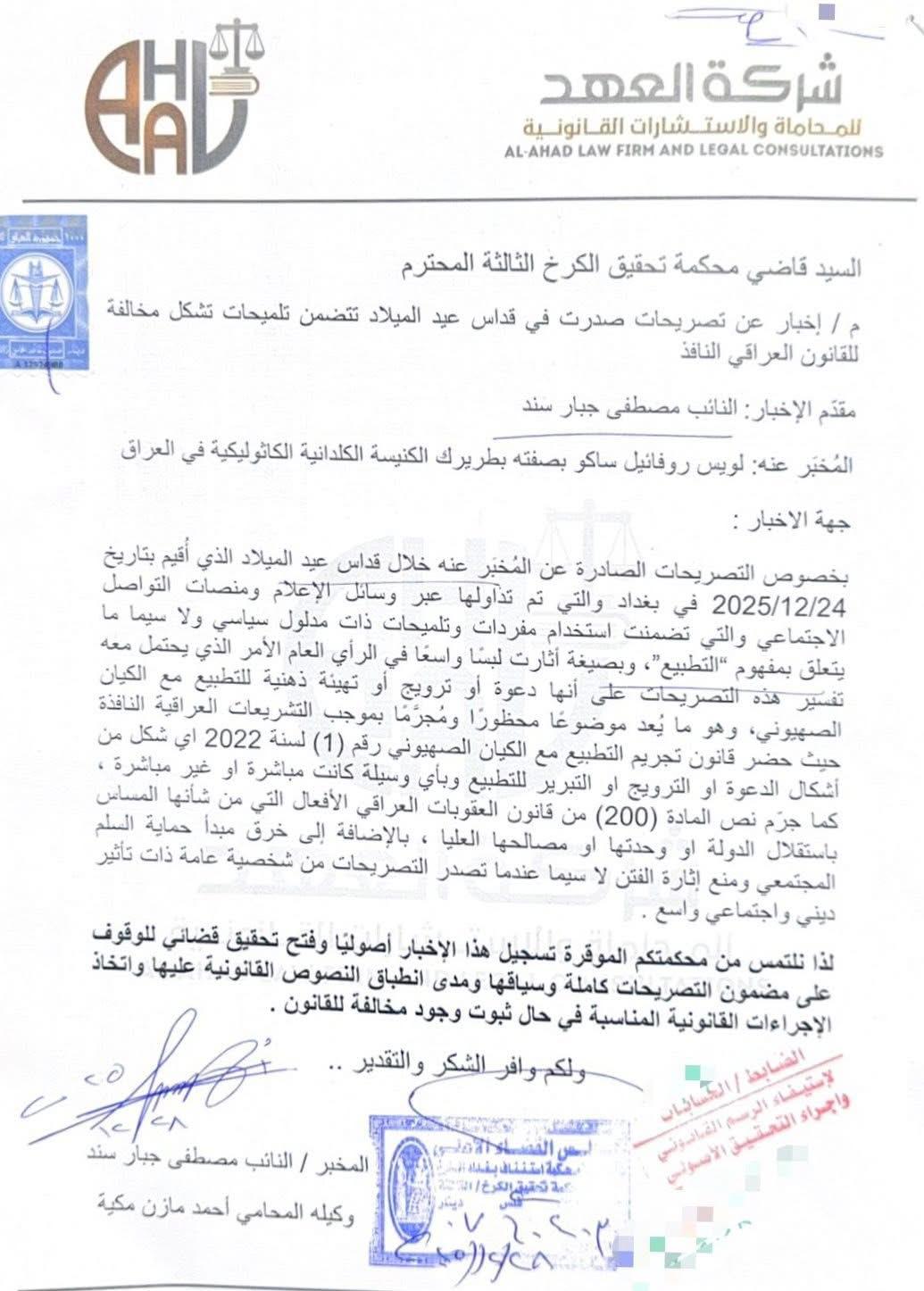 وثيقة رسمية الى محكمة/ اخبار عن تصريح البطرك ساكو عن التطبيع مع اسرائيل في قداس عيد الميلاد