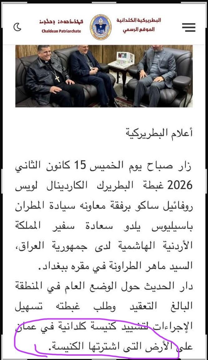 ولكن إستوقفتني هذه الزيارة لأن لدي وثائق ومعلومات عن حيثية الورطة التي وقع فيها لويس ساكو في الأردن نتيجة تصرف له غير مسؤول جرى على أثره سحب الإجازة الممنوحة لبناء كنيسة كلدانية (كنيسة مار توما الرسول) التي هو بنفسه وضع حجر الأساس لها في تموز من العام المنصرم وبحضور رسمي من أعلى المستويات يتقدمهم الأمير غازي بن محمد وهو شخصية محورية في الأردن فيما يتعلق بالشؤون الدينية والثقافية.